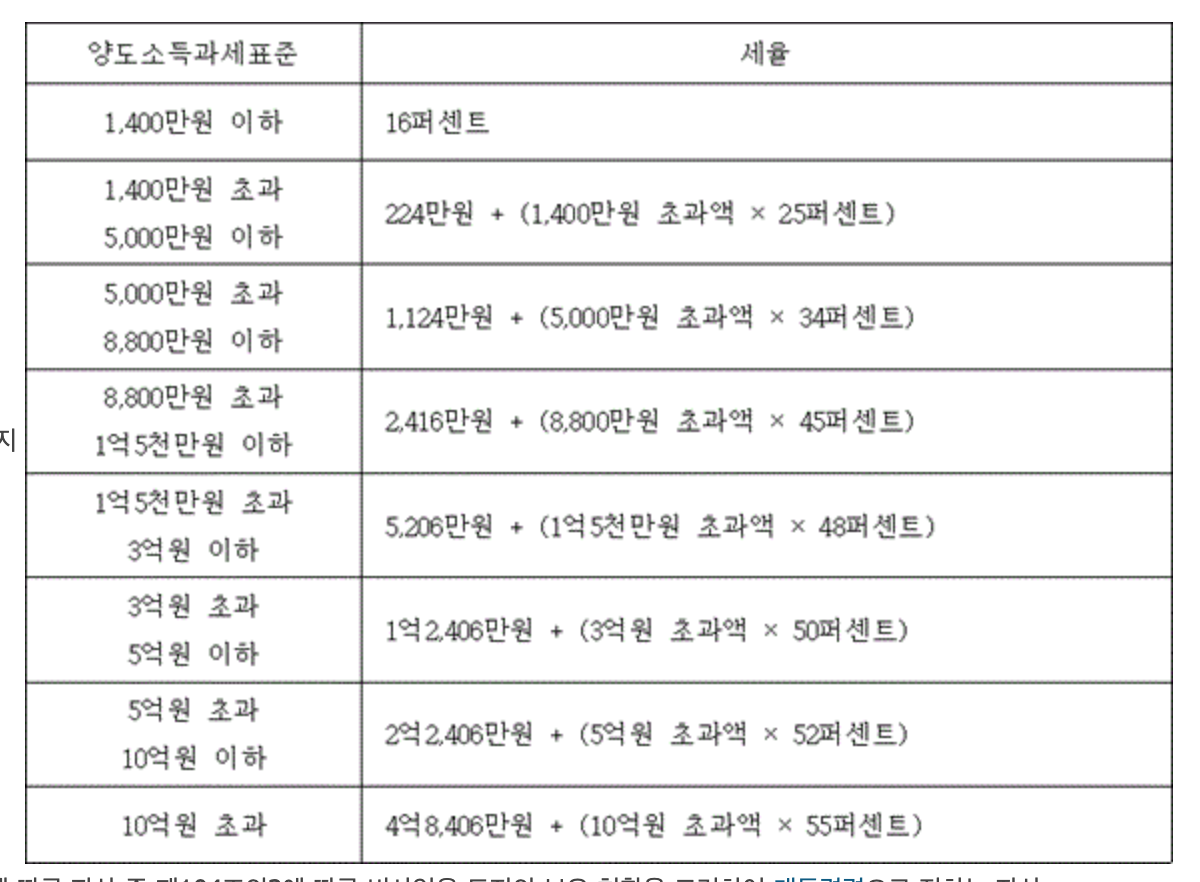 분양권의 경우는 양도소득과세표준의 60%, 미등기양도자산의 경우 70%입니다. 기본적으로 1400만원 이하부터 16%로 시작해서 3억원 초과부터 50% 넘어가면서 세금에 대한 부담이 아주 커집니다.