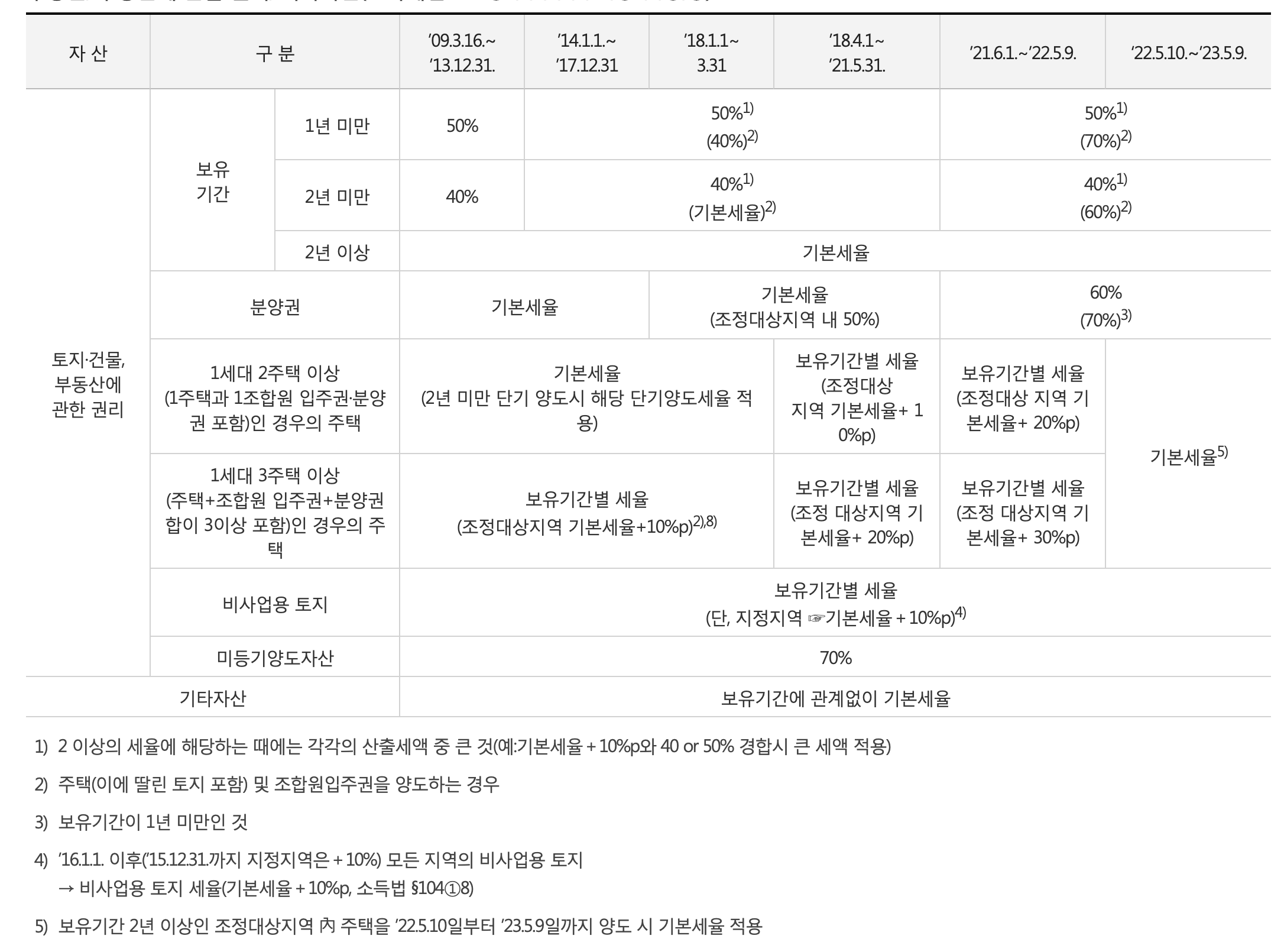 토지든지 건물이든지 보유기간은 1년 미만이라면 50%, 2년 미만이라면 40% 입니다. 그 이후는 양도세율의 기본세율을 가져갑니다.