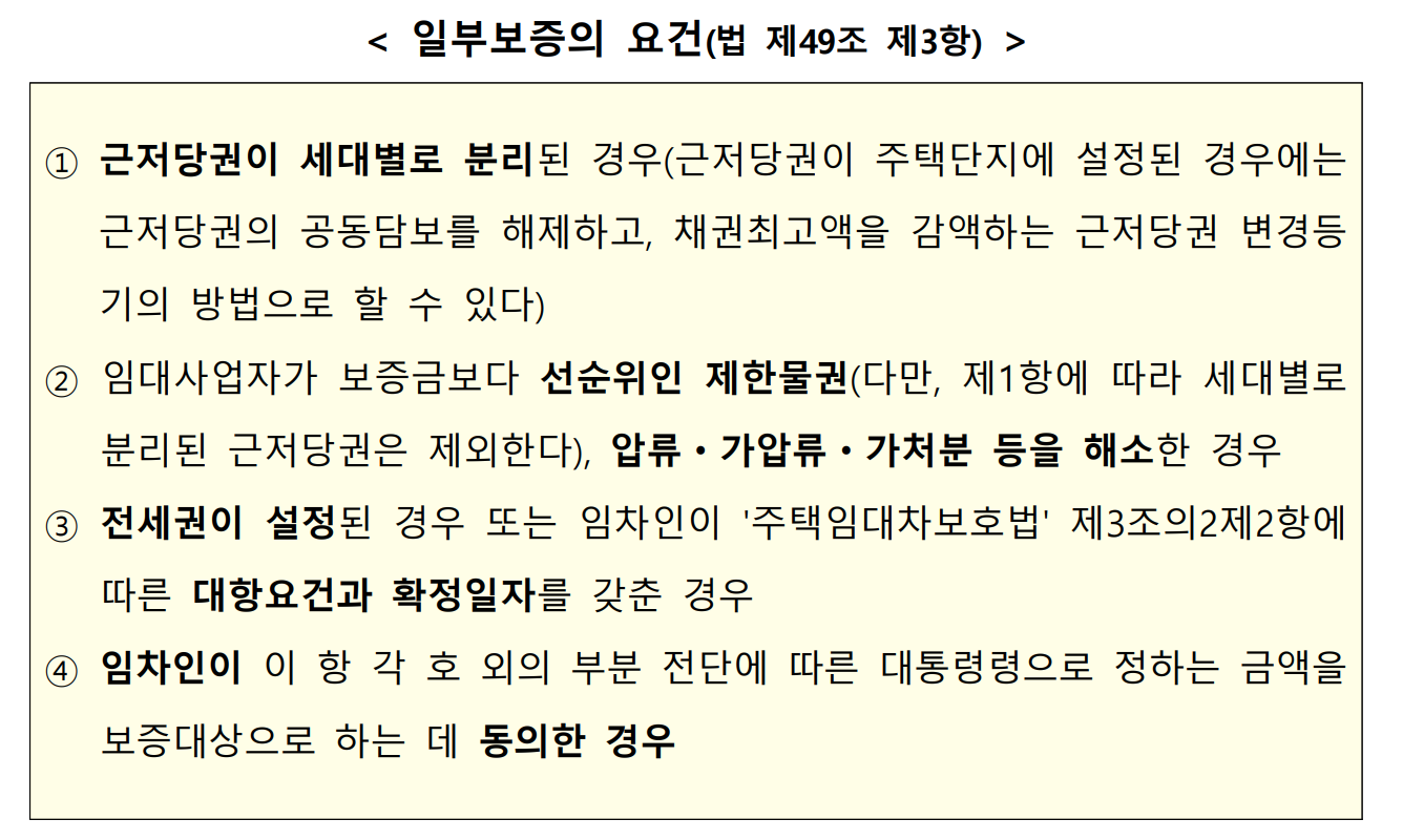 이미 전세권이 설정된 경우는 선순위로 보증금이 대항력을 갖기 때문에 부분보증을 해도 상관없다고 보는 것 같습니다. 4번의 경우는 일부 보증금액은 근저당금액(은행 대출) + 임대보증금 - 주택가격의 60% 입니다.